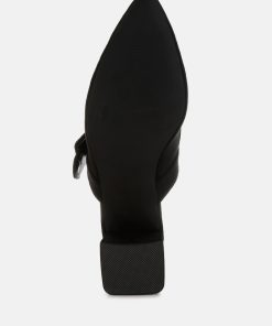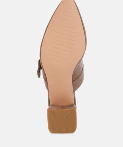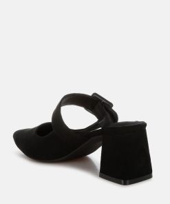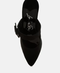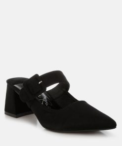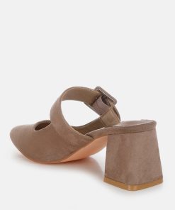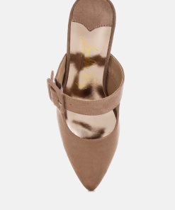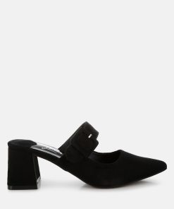 The mules have a Parisian chic flair with the matte finish of the microfiber upper and the pointed heel that gives it a stylish look. The pin buckle strap detail definitely takes the design up a notch in visual aesthetics. The soft cushion insoles ensure a comfortable fit.
