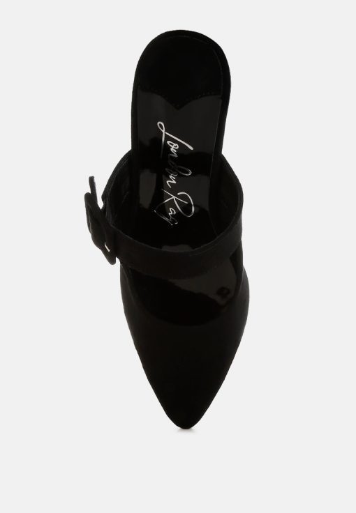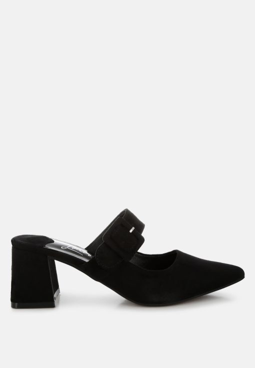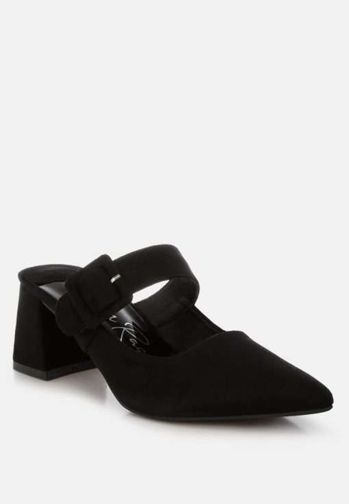 The mules have a Parisian chic flair with the matte finish of the microfiber upper and the pointed heel that gives it a stylish look. The pin buckle strap detail definitely takes the design up a notch in visual aesthetics. The soft cushion insoles ensure a comfortable fit.