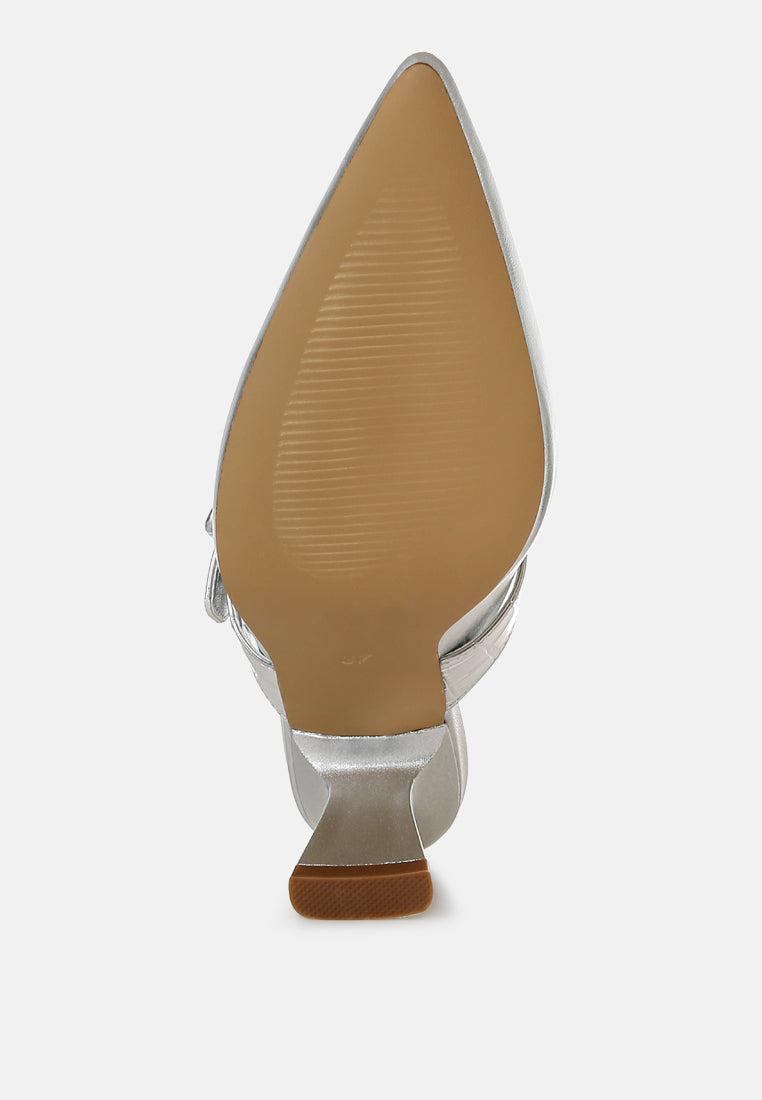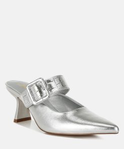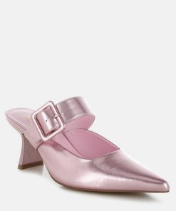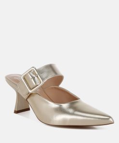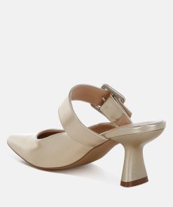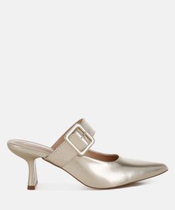 Make every step a sun-kissed one with these gorgeous faux leather mule heels. The super chic kitten heel with a large pin buckle ankle strap detail is everything you need for your next party or a special dinner night. Pair these kitten heel mules featuring plush cushion insoles with denim, evening gowns, and more!