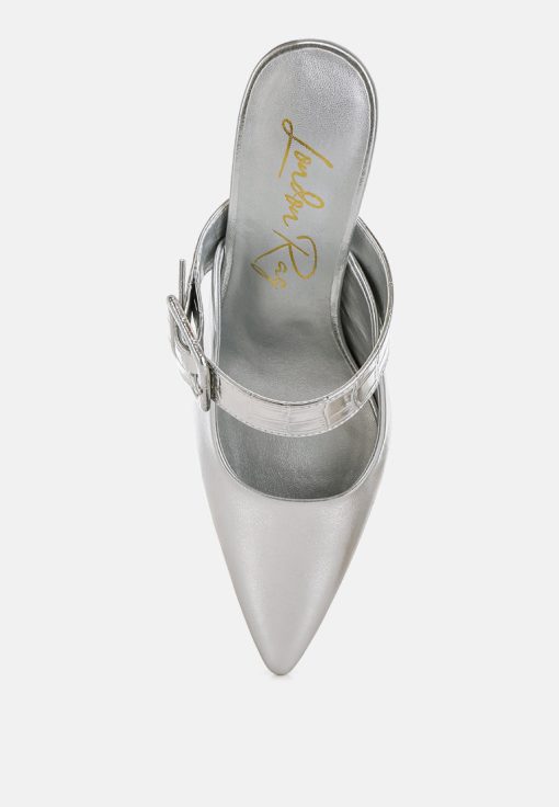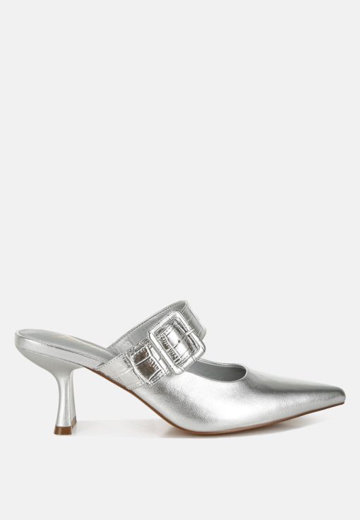Make every step a sun-kissed one with these gorgeous faux leather mule heels. The super chic kitten heel with a large pin buckle ankle strap detail is everything you need for your next party or a special dinner night. Pair these kitten heel mules featuring plush cushion insoles with denim, evening gowns, and more!