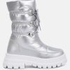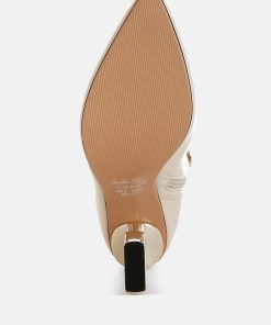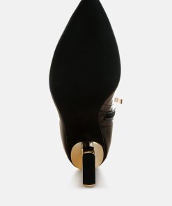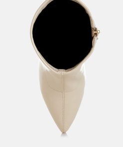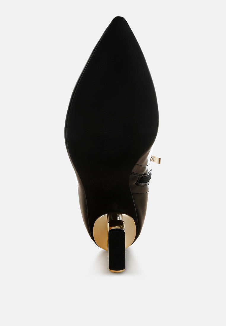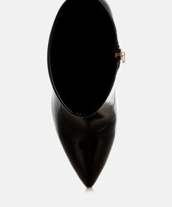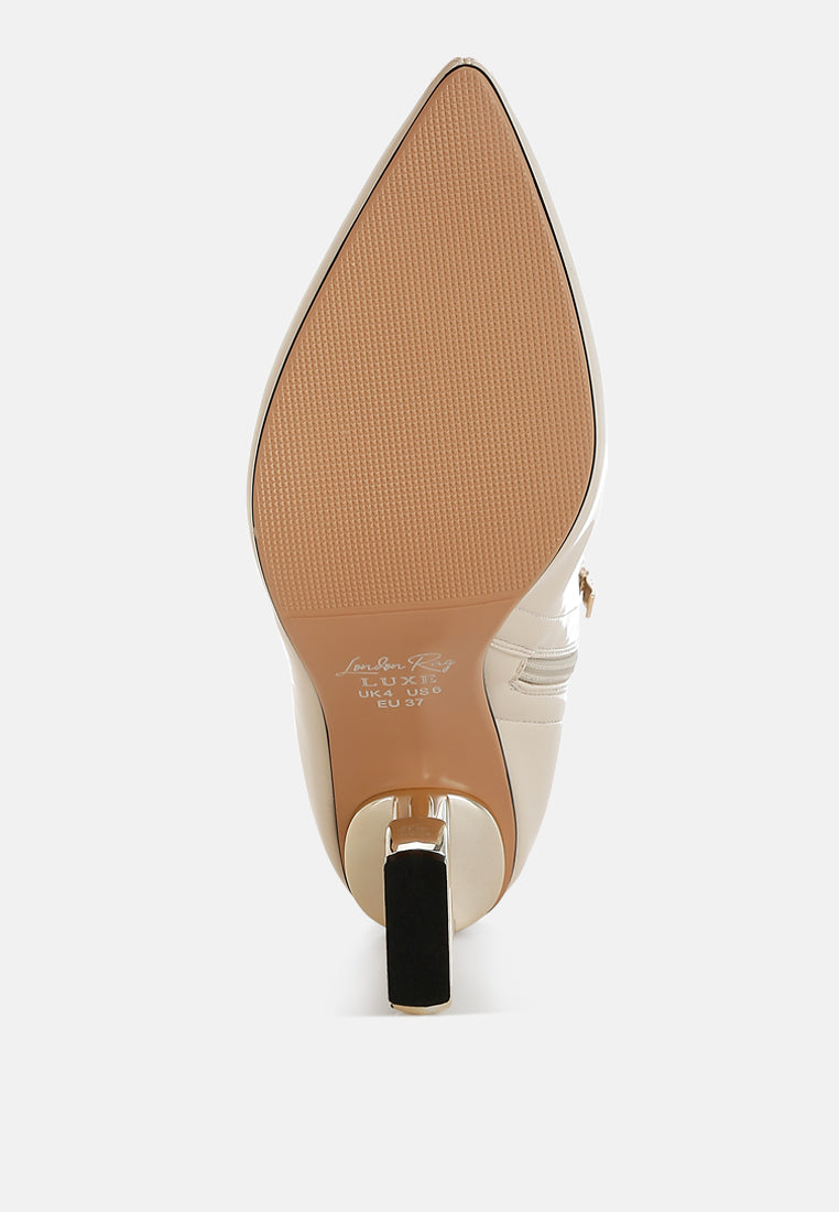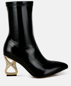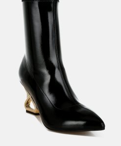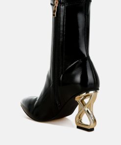 The heeled boots have a unique aesthetic with the metallic fantasy heel that accentuates the overall aesthetic of the boots while the shine of the patent faux leather upper adds another fashionable factor. The boots are perfect for when you want to be subtle yet impactful with your ensemble. The boots have comfortable cushion insoles that cut strain and offer a relaxed fit experience.