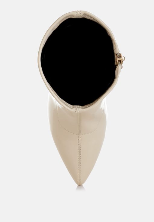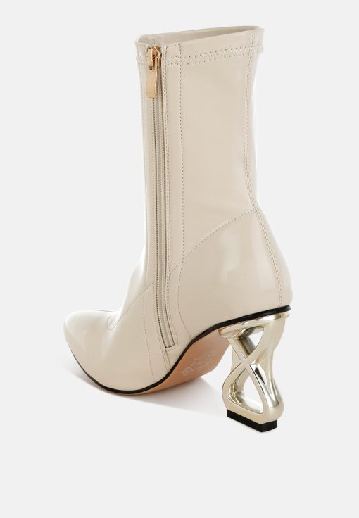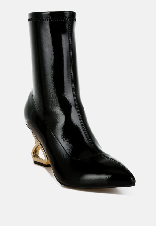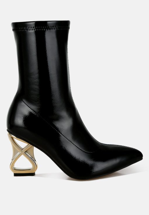 The heeled boots have a unique aesthetic with the metallic fantasy heel that accentuates the overall aesthetic of the boots while the shine of the patent faux leather upper adds another fashionable factor. The boots are perfect for when you want to be subtle yet impactful with your ensemble. The boots have comfortable cushion insoles that cut strain and offer a relaxed fit experience.