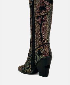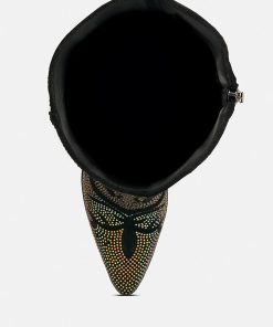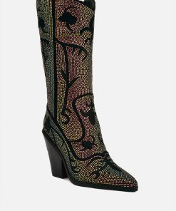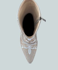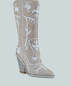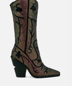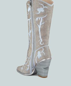 Take your West fashion up a notch with these intricately embellished rhinestone boots with embroidery detailing which just amplifies the overall look of the calf boots. The boots would make stunning transition shoes and add just the right amount of oomph to your fit!