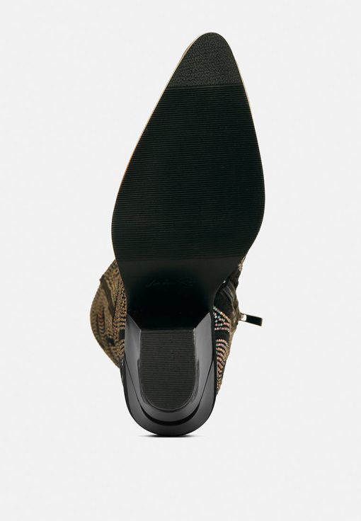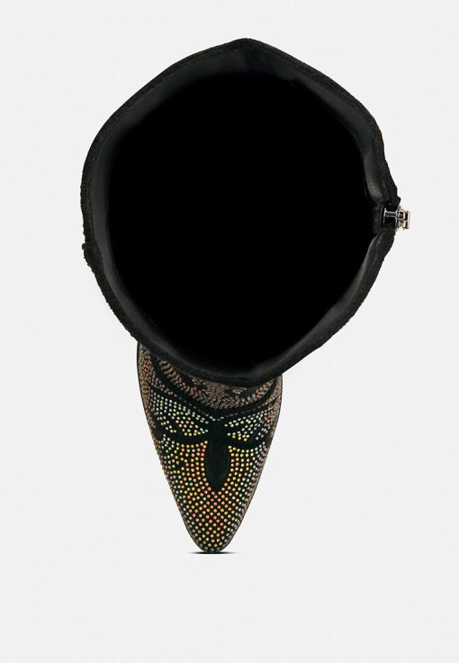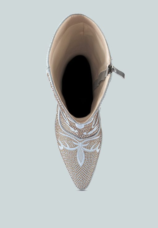 Take your West fashion up a notch with these intricately embellished rhinestone boots with embroidery detailing which just amplifies the overall look of the calf boots. The boots would make stunning transition shoes and add just the right amount of oomph to your fit!