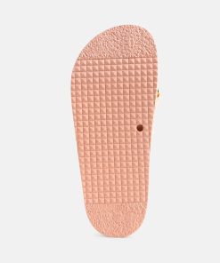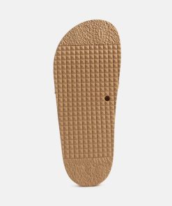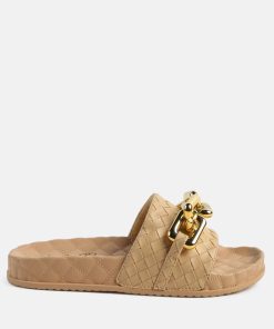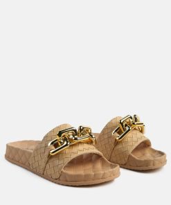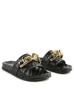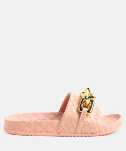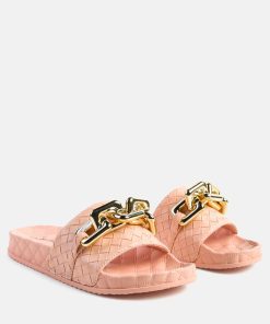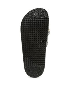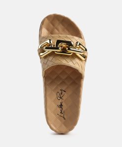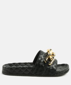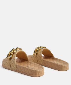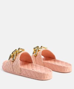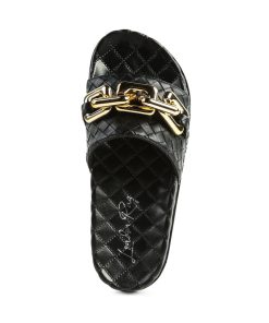 With molded footbed in quilt design, the pair of beautiful slides have shiny metal chai on top. Looks gorgeous on the feet and is a trendy design.