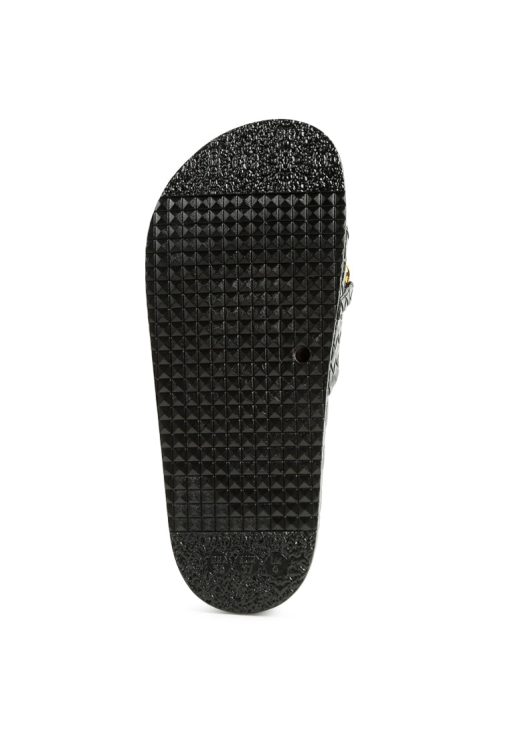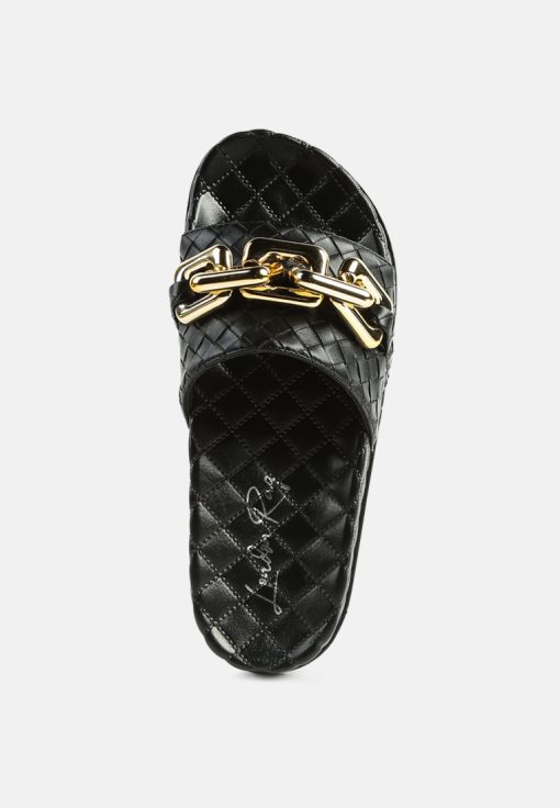 With molded footbed in quilt design, the pair of beautiful slides have shiny metal chai on top. Looks gorgeous on the feet and is a trendy design.