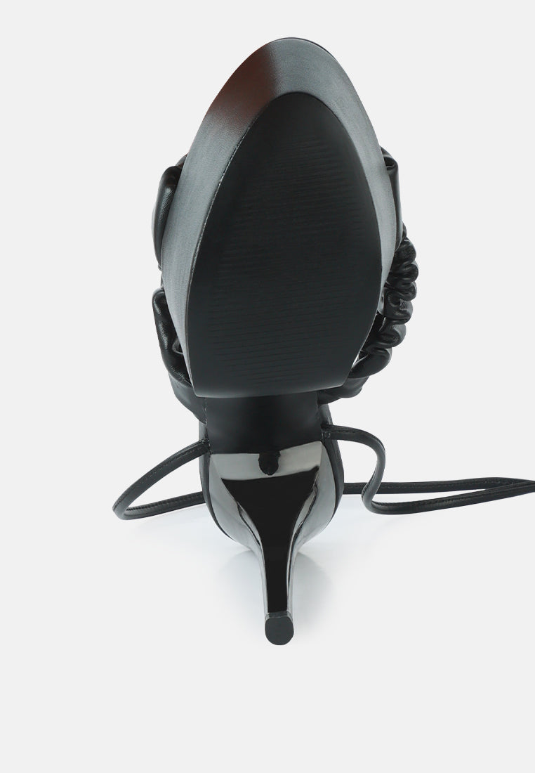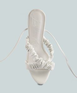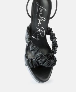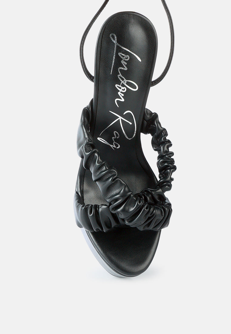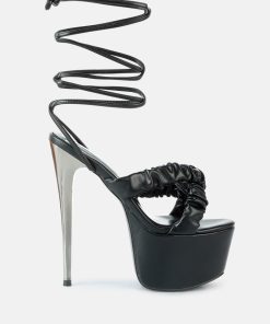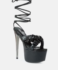 Scrunchie strapped ultra high heeled sandals in faux leather – the stylish and trendy syle has tie up design and is built on high platform which gives it extra height. Fire up your style and social media with these on your feet!