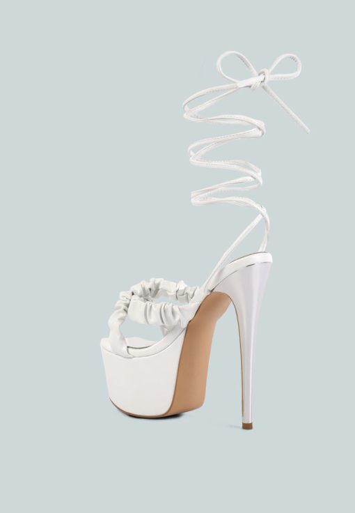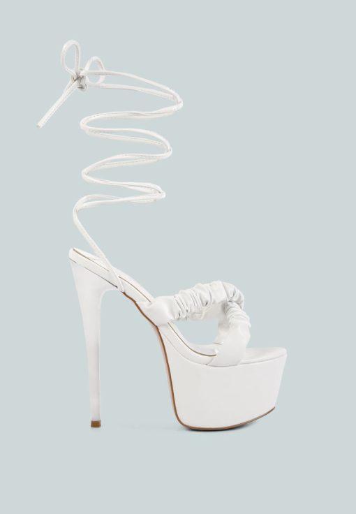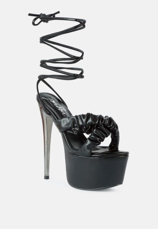 Scrunchie strapped ultra high heeled sandals in faux leather – the stylish and trendy syle has tie up design and is built on high platform which gives it extra height. Fire up your style and social media with these on your feet!
