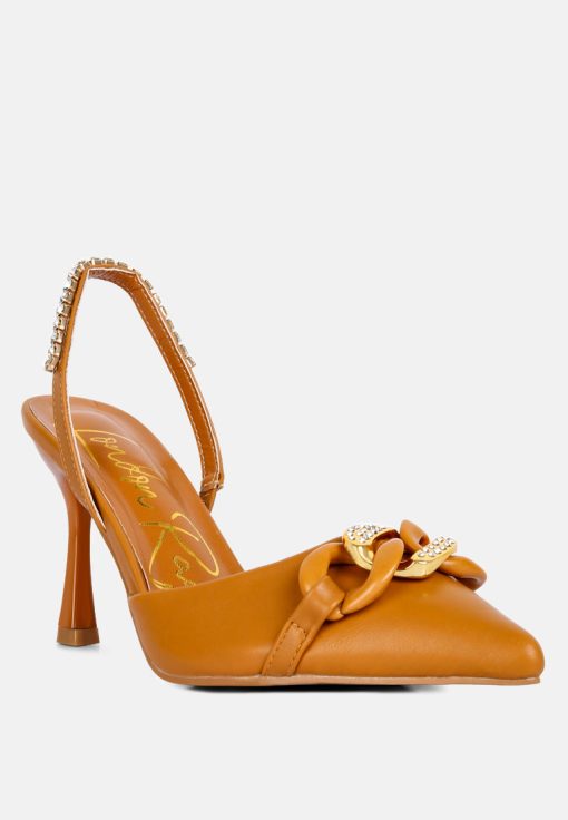 If these diamante embellished chain sandals had a name, it would be sheer luxury combined with class. The sandals have metallic chains and diamante detailing on the vamp. With a soft cushion insole, they make for the best after-party shoes, wedding heels, wedding guest shoes, and more!