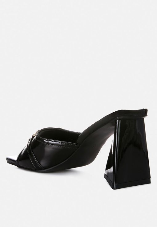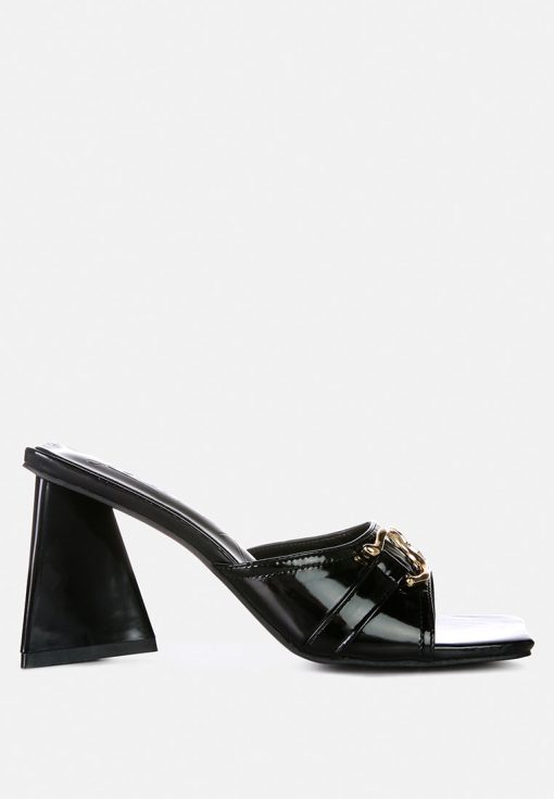 The slip-on triangular block heel sandals ooze sexiness and scream style while staying incredibly easy to wear. What catches the eye is the horse-bit buckle detail adorning the front, adding the right amount of drama. Wear these beauties on bright sunny days or with evening dresses for a party.