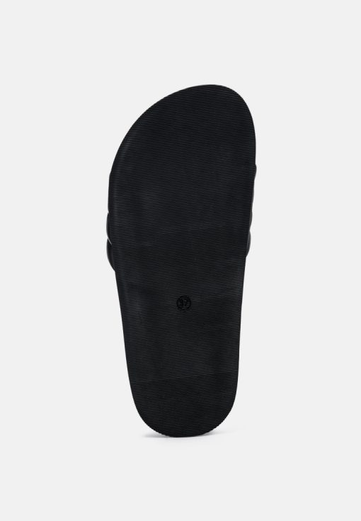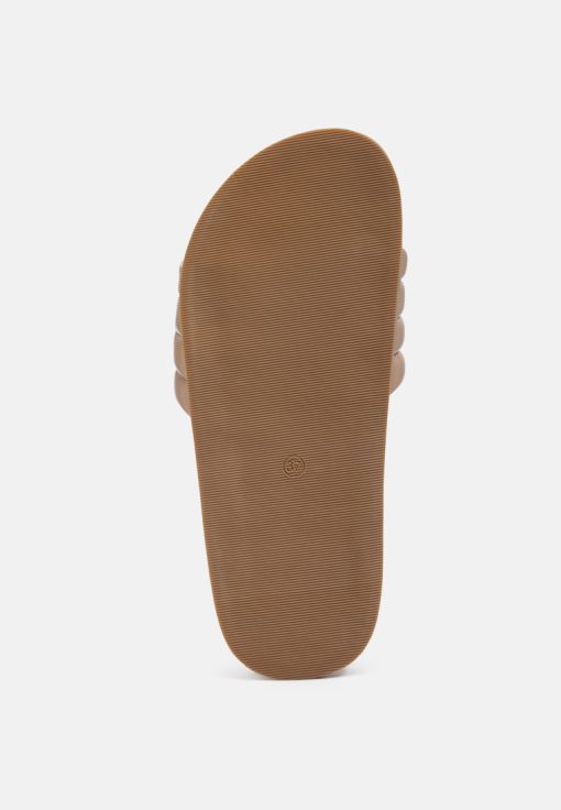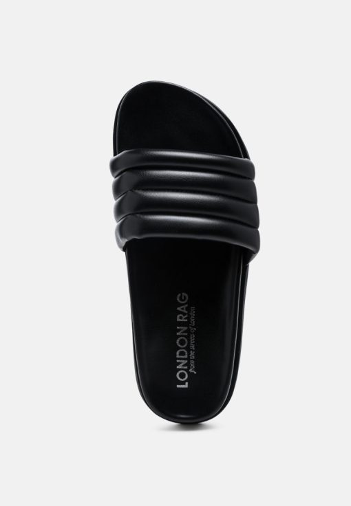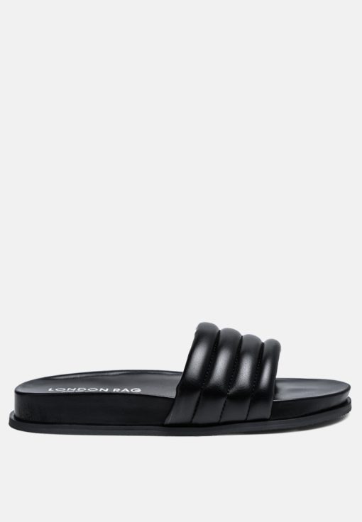 Quilted Strap Pool slides which offer great wear across surfaces, can be worn indoors and outdoors alike. The round-toe flats are all-day comfy pairs.