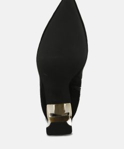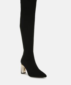 The long boots are stylish and sleek, and have a pop of glamour with the metallic accent flared slim block heels. The long boots have a minimalist aesthetic with a touch of bling and would pair beautifully with short skirts and faux leather shorts from London Rag.