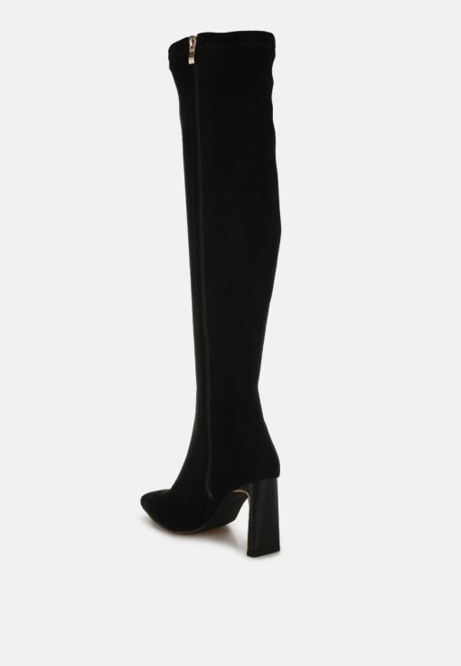 The long boots are stylish and sleek, and have a pop of glamour with the metallic accent flared slim block heels. The long boots have a minimalist aesthetic with a touch of bling and would pair beautifully with short skirts and faux leather shorts from London Rag.
