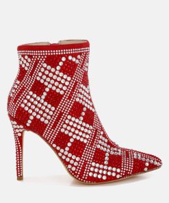 Opulent, indulgent, comfortable—meet your new ankle-length stiletto boots. They have a soft microfiber upper and patterned rhinestone embellishment. With a side zipper fastening and 4-inch rhinestone-studded stiletto heel, these party boots are one pair that will soon turn into your price possession.