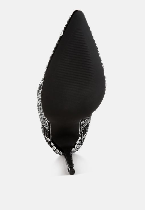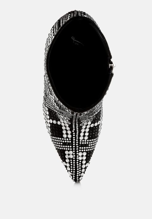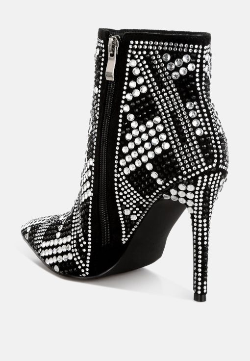 Opulent, indulgent, comfortable—meet your new ankle-length stiletto boots. They have a soft microfiber upper and patterned rhinestone embellishment. With a side zipper fastening and 4-inch rhinestone-studded stiletto heel, these party boots are one pair that will soon turn into your price possession.