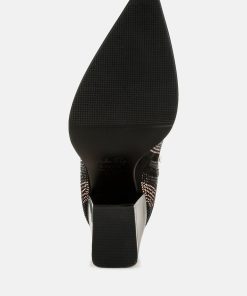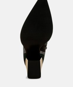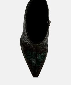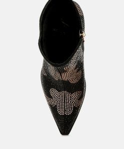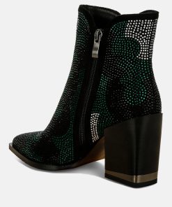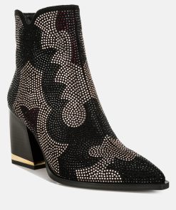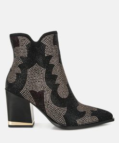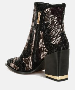 The partywear boots are elegant yet bold with the rhinestones embellishment which gives them a statement look. The stylish boots have an eccentric look with patterned adornments while the block heel and comfortable cushion insoles cut strain and offer a relaxed fit.