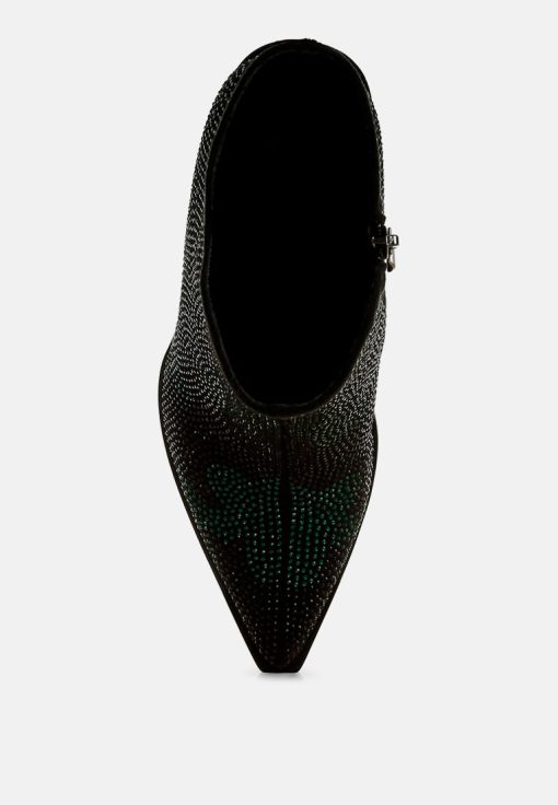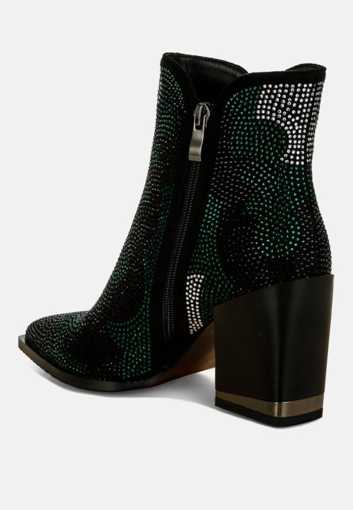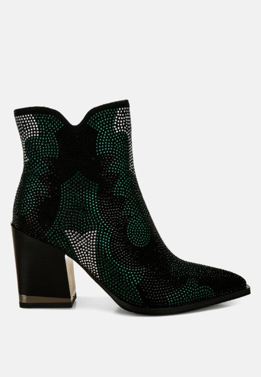 The partywear boots are elegant yet bold with the rhinestones embellishment which gives them a statement look. The stylish boots have an eccentric look with patterned adornments while the block heel and comfortable cushion insoles cut strain and offer a relaxed fit.